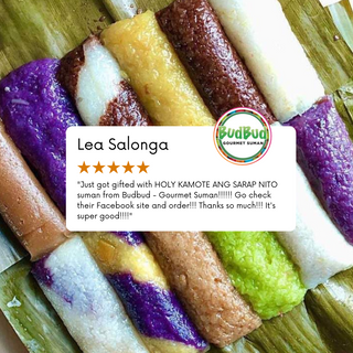 Budbud Gourmet Suman began around 20 years ago. Our family hails from Dumaguete, Bais and Tanjay where suman is very popular. The flavored suman being sold there had never been seen in the Manila market so we saw an opportunity to take it here. We decided to elevate this famous Filipino dish by using all natural ingredients, no preservatives. And to ensure the high quality of our suman, we source the ingredients directly from the farmers and NGO communities.